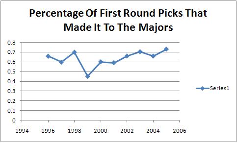 So I'm going to be careful about drawing conclusions from the graph but a few things stick out. First in the 10 year stretch from 1996 to 2005, no season has had more than 72% of the player make it to the majors. There also seems to be a trend of more players making it to the majors in recent years. This probably means one of two things. Either draft reports are getting better, so the better players are being drafted in the first round. Or, teams are more likely to rush players to the majors, meaning poor ability players are actually playing in the majors where in the past they may not have. Most likely, it is a combination of both situations.